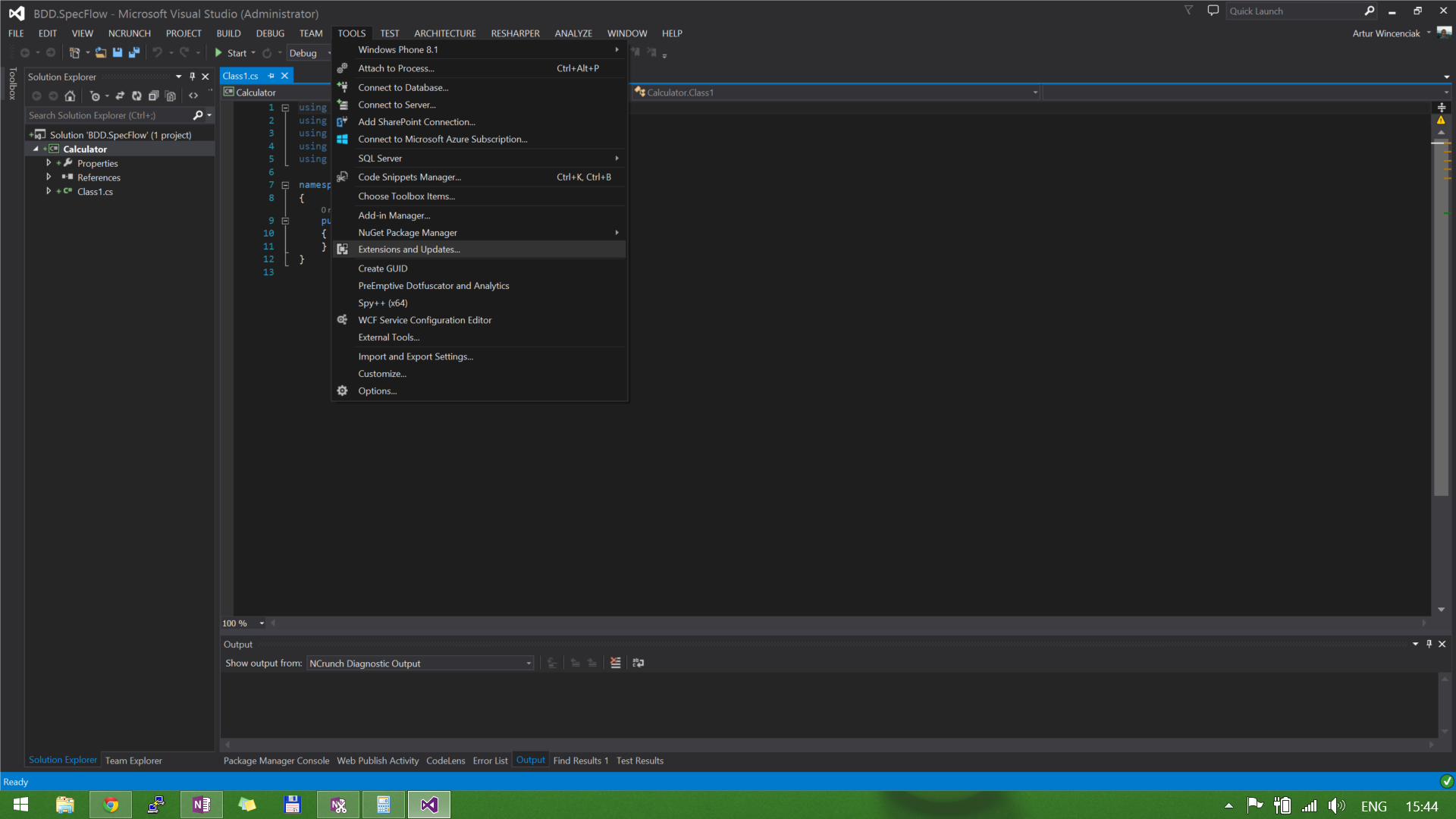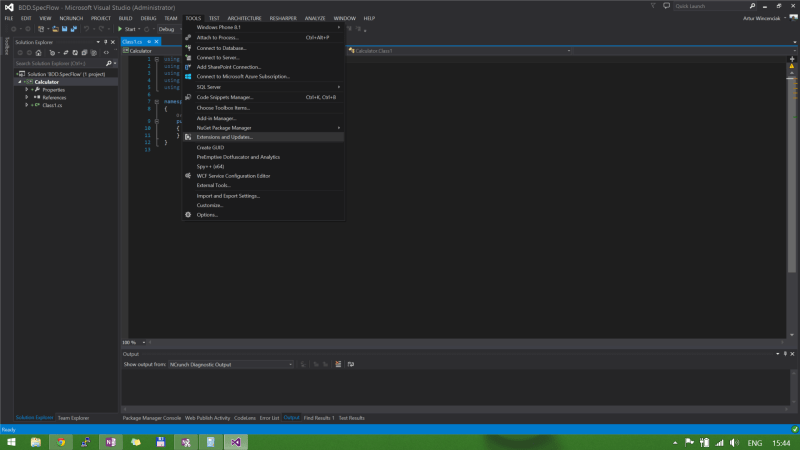 14 stycznia 201814 stycznia 2018 by Teo Vincent Artur Wincenciak 03. Extension and Updates Dodaj komentarz Pierwszym krokiem jest zainstalowanie narzędzia, które zautomatyzuje BDD. W tym celu wybieram opcję „Extension and Updates …”.