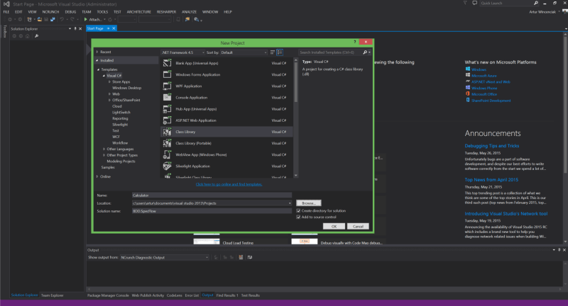 14 stycznia 201814 stycznia 2018 by Teo Vincent Artur Wincenciak 01. Nowy projekt Dodaj komentarz Tworzę nową solucję z nowym projektem „Class Library”.