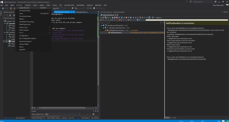 14 stycznia 201814 stycznia 2018 by Teo Vincent Artur Wincenciak 20. NCrunch Dodaj komentarz Aby sobie ułatwić odpalanie testów, uruchamiam sobie dodatkowo, niezależne narzędzie NCrunch do automatycznego odpalania testów jednostkowych. Nie jest ono wymagane, aby pisać zgodnie z BDD. Kto o nim jeszcze nie słyszał niech zgoogluje — polecam.