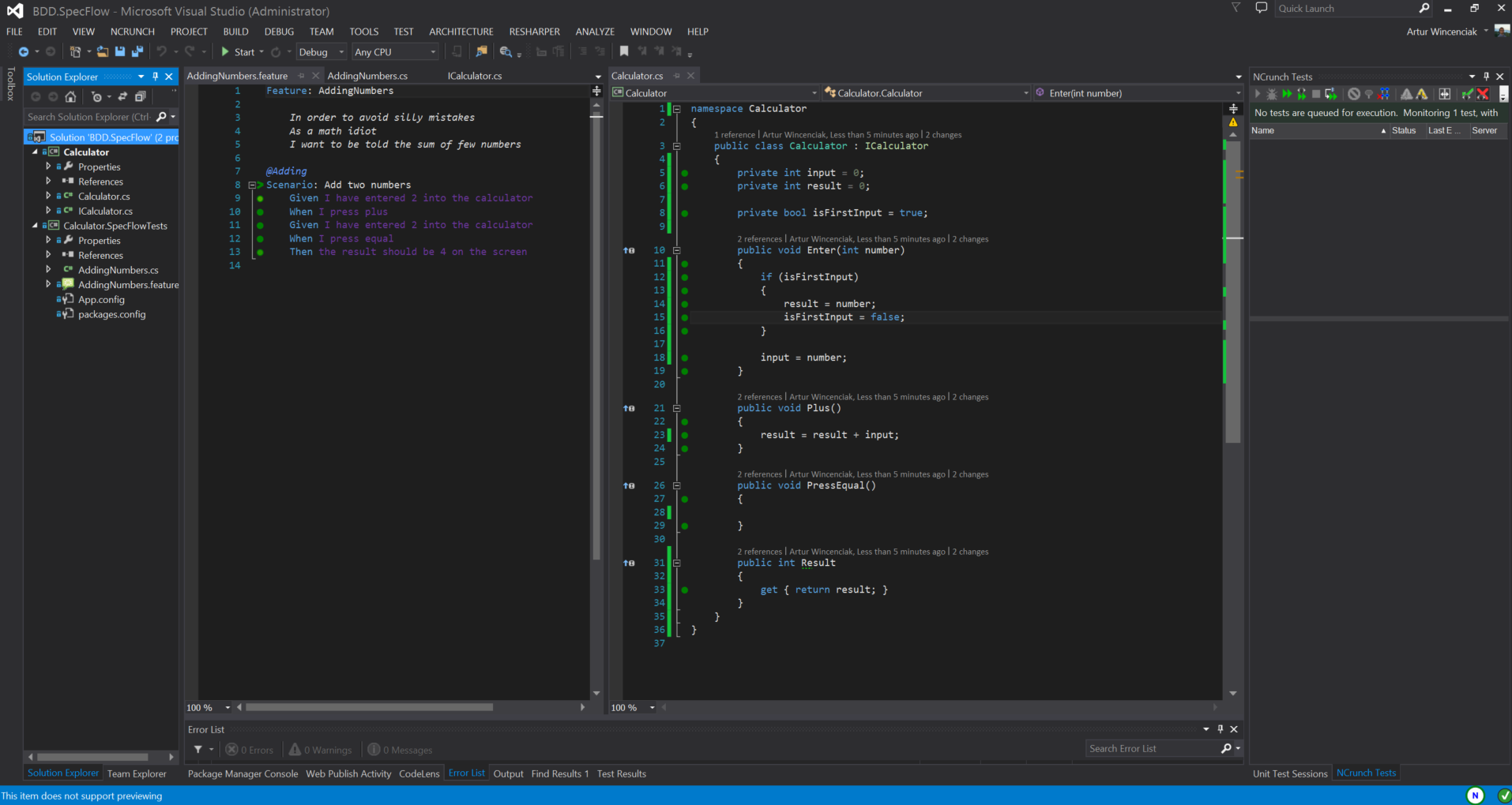 14 stycznia 201814 stycznia 2018 by Teo Vincent Artur Wincenciak 24. Wreszcie zielono Dodaj komentarz Wreszcie zielono…, czyli mam pierwszą wersję kodu produkcyjnego spełniającego test. Niby działa, ale w kolejnych krokach będziemy definiować kolejne wymagania, które z pewnością zmienią aktualną implementację.