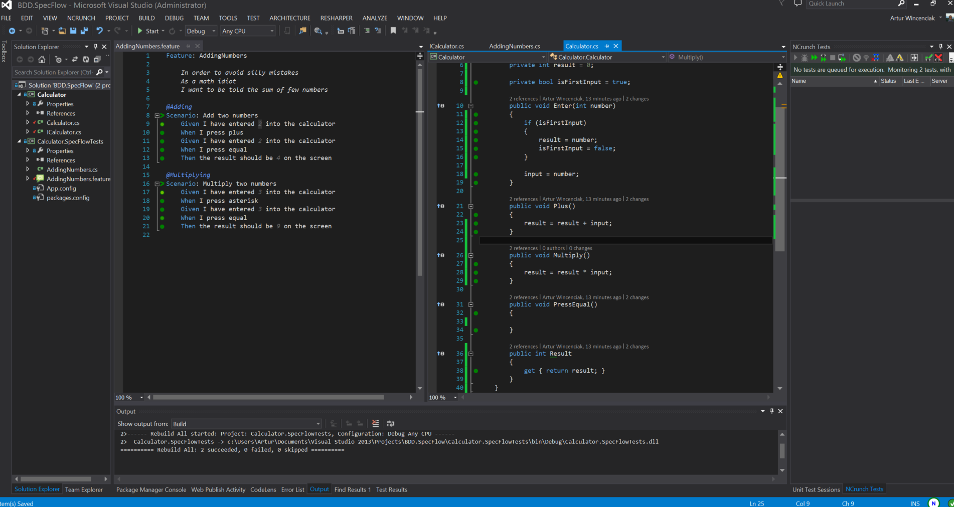 14 stycznia 201814 stycznia 2018 by Teo Vincent Artur Wincenciak 28. Zielono Dodaj komentarz Analogiczna implementacja jak w przypadku dodawania wystarczyła, aby zapalić testy na zielono. Wszystko jest O.K. Niepokoi mnie tylko to, że cały czas metoda „PressEqual” pozostaje bez implementacji. Coś mi tu śmierdzi, ale idźmy dalej.