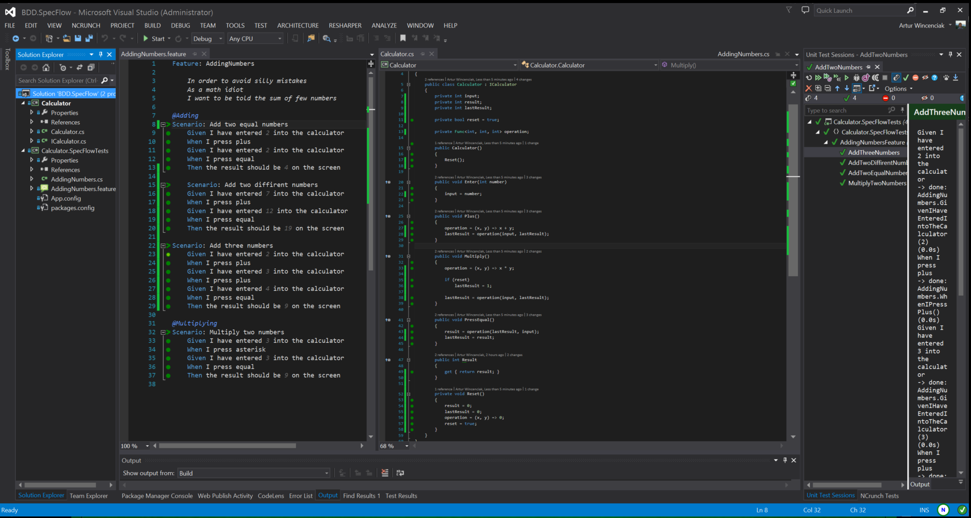 Voilà… Wszystko jest zielone. Mnożenie nie działało, ponieważ aby wystartować z mnożeniem wartość początkowa, przez którą będziemy mnożyć, musi być różna zeru. W poprzedniej wersji kodu zmienna „lastResult” zawsze miała wartość zero, co znakomicie sprawdzało się dla dodawania. W przypadku mnożenia już nie jest O.K. ponieważ każda liczba pomnożona przez zero daje nam zero. Aby operacja mnożenia wystartowała poprawnie, należy na starcie, wypełnić zmienną „lastResult” wartością jeden.